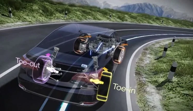 در سرعت پایین زاویه چرخش چرخهای عقب خلاف جهت چرخهای جلو و در سرعت بالا همجهت با آنها است.