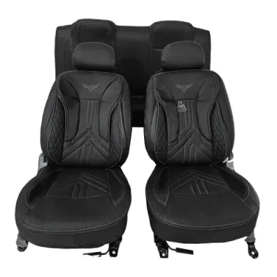 روکش صندلی پراید 111 از چرم مصنوعی PU ایرانی به همراه چرم گلدوزی شده در قسمت نشیمن گاه و تکیه گاه که برای زیبایی دو چندان محصول استفاده شده است.